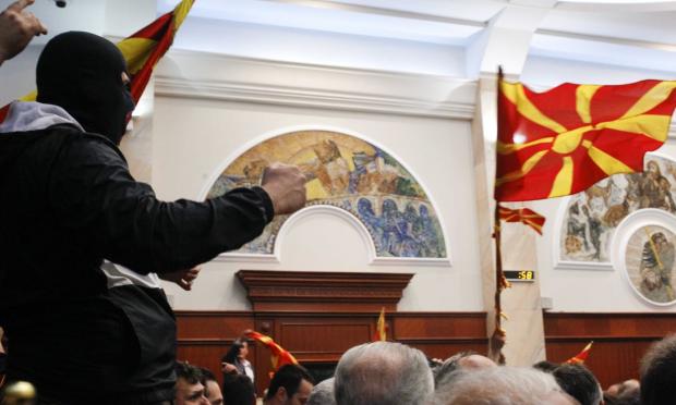 Εκατοντάδες διαδηλωτές, οπαδοί του VMRO -DPMNE του Νίκολα Γκρούεφσκι, εισέβαλαν στο κοινοβούλιο και επιτέθηκαν σε βουλευτές του Σοσιαλδημοκρατικού κόμματος και των κομμάτων της αλβανικής μειονότητας, οι οποίοι εκείνη την ώρα εξέλεγαν πρόεδρο του Κοινοβουλίου.