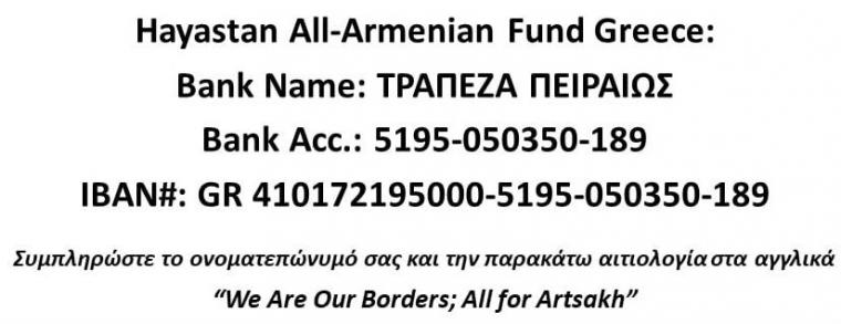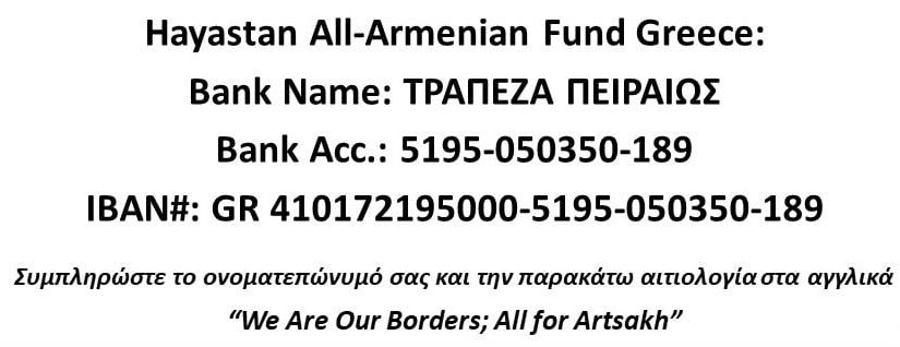 Έρανο για την οικονομική ενίσχυση των αρμενικών δυνάμεων της Δημοκρατίας του Αρτσάχ (Ναγκόρνο Καραμπάχ), που αμύνονται ενάντια στους Αζέρους Τούρκους και τους τζιχαντιστές μισθοφόρους, πραγματοποιεί η Αρμενική Εθνική Επιτροπή Ελλάδος.