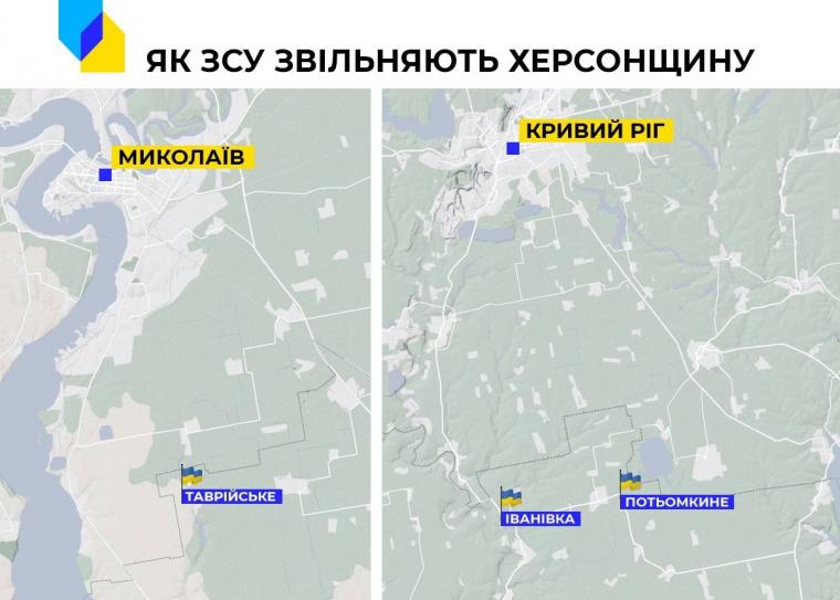 Μόνο τρεις οικισμοί στην περιφέρεια Χερσώνα έχουν απελευθερωθεί επισήμως μέχρι στιγμής: τα χωριά Tavriyske, Potemkino και Ivanovka. Οι πληροφορίες για τη ανακαταληψη τους έρχονται από τα τέλη Ιουνίου. Από τότε δεν έχει αναφερθεί νέα πρόοδος.