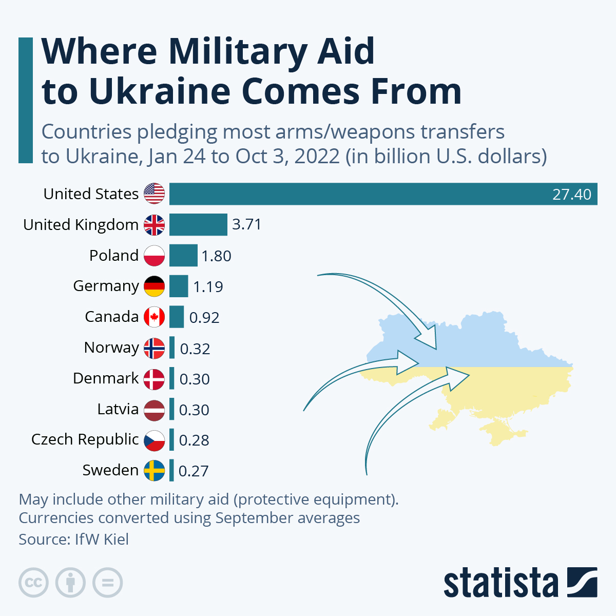Εξετάζοντας τις υποσχέσεις για στρατιωτική βοήθεια προς την Ουκρανία μεταξύ 24 Ιανουαρίου και 3 Οκτωβρίου, η κυβέρνηση των ΗΠΑ έχει δεσμευτεί να παρέχει τα περισσότερα όπλα, όπλα και άλλο εξοπλισμό με διαφορά. Όπως αναφέρει η Katharina Buchholz της Statista, περισσότερα από 27 δισεκατομμύρια δολάρια σε στρατιωτική βοήθεια υποσχέθηκαν μέχρι τη δεδομένη ημερομηνία, σύμφωνα με το Ukraine Support Tracker από το Ινστιτούτο του Κιέλου για την Παγκόσμια Οικονομία.