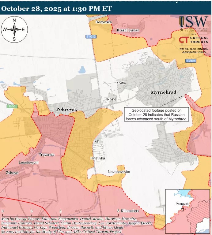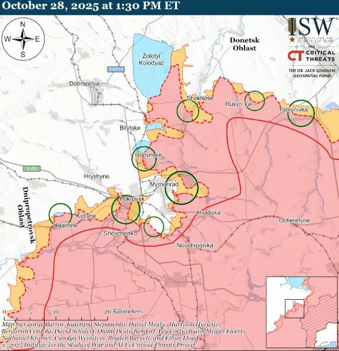Ο ουκρανικός στρατός ανησυχεί ολοένα και περισσότερο ότι τα ρωσικά στρατεύματα κινούνται τώρα για να περικυκλώσουν τις δυνάμεις του ακριβώς ανατολικά του Ποκρόφσκ. Οι χάρτες του DeepState δείχνουν τις ρωσικές δυνάμεις να κινούνται σε δύο απότομα σημεία από το κέντρο της πόλης και τα χωριά στα βορειοανατολικά. Μόνο λίγα μίλια χωρίζουν τις στρατιωτικές προελάσεις, αναγκάζοντας τις ουκρανικές ενισχύσεις στην περιοχή να κινούνται μέσα από έναν στενό διάδρομο υπό συνεχή πυρά.