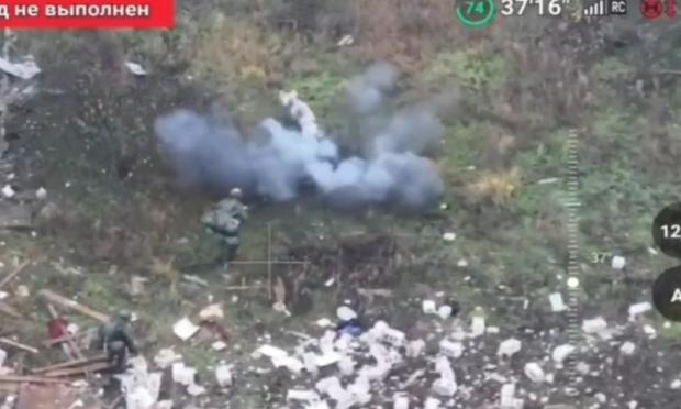 Το βίντεο, που τραβήχτηκε με drone, δείχνει δύο Ρώσους στρατιώτες εφόδου να πλησιάζουν ένα κατεστραμμένο κτίριο, με ένα γουρούνι κοντά.