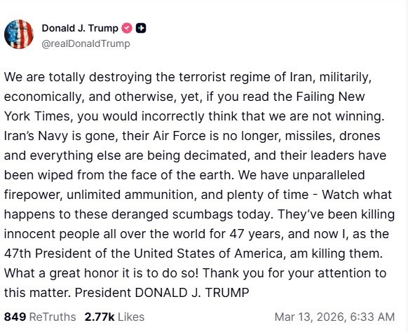 Ο Τραμπ έγραψε: «Τους σκοτώνω... Τι μεγάλη τιμή να το κάνω!», συνδέοντας τον αριθμό 47 της προεδρίας του με τα 47 χρόνια δράσης του ιρανικού καθεστώτος. Υποστήριξε ότι η αμερικανική δύναμη πυρός είναι απεριόριστη και ότι έχει όλο τον χρόνο να ισοπεδώσει τους εχθρούς του, την ώρα που νέες, τρομακτικές εκρήξεις συγκλόνιζαν την Τεχεράνη, φωτίζοντας τον νυχτερινό ουρανό με το χρώμα του αίματος.