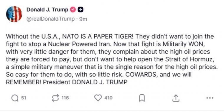 «Χωρίς τις ΗΠΑ, το ΝΑΤΟ ΕΙΝΑΙ ΜΙΑ ΧΑΡΤΙΝΗ ΤΙΓΡΗ!» έγραψε ο Τραμπ στην πλατφόρμα του Truth Social. «Δεν ήθελαν να συμμετάσχουν στον αγώνα για να σταματήσουν ένα πυρηνικό Ιράν».