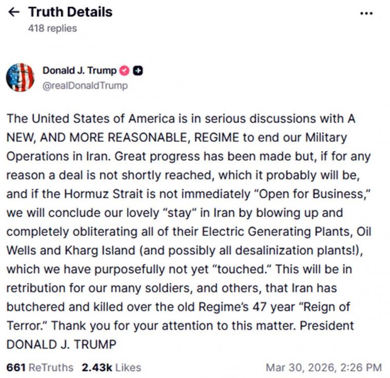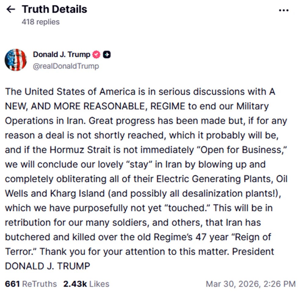 Σε μια ανάρτηση που θυμίζει σενάριο ταινίας καταστροφής, ο Ντόναλντ Τραμπ αποφάσισε να τινάξει τη διπλωματική σκακιέρα στον αέρα. Με το γνωστό του, απροκάλυπτο ύφος, ο Αμερικανός πρόεδρος εξαπέλυσε έναν ωμό εκβιασμό προς την Τεχεράνη, Ή υπογράφετε συμφωνία «χθες» και ανοίγετε τα Στενά του Ορμούζ «για δουλειές», ή οι ΗΠΑ θα μετατρέψουν το Ιράν σε μια σκοτεινή, άνυδρη έρημο.