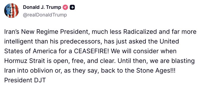 Ο όρος του Τραμπ: «Θα συζητήσουμε για εκεχειρία ΜΟΝΟ όταν το Στενό του Ορμούζ ανοίξει και γίνει ξανά απόλυτα ασφαλές για εμάς και τους συμμάχους μας», ξεκαθάρισε.