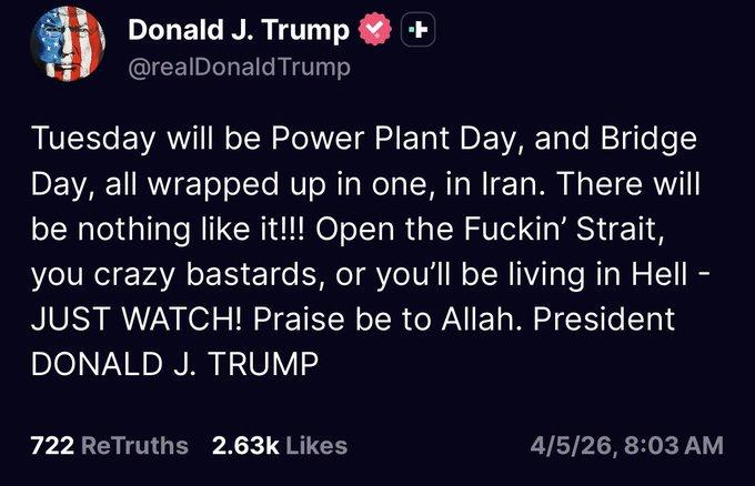 Η κήρυξη της ερχόμενης Τρίτης ως «Ημέρας Εργοστασίου Παραγωγής Ενέργειας και Γέφυρας» αποτελεί το τελεσίγραφο ενός ανθρώπου που δεν δέχεται πια καμία άλλη απάντηση πέρα από την απόλυτη υποταγή. Μετά τον βομβαρδισμό των στρατηγικών γεφυρών κοντά στην Τεχεράνη, ο Τραμπ στοχοποιεί πλέον την καρδιά της ιρανικής επιβίωσης: το ηλεκτρικό δίκτυο.