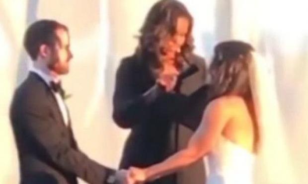 Σε βίντεο που έχει στην κατοχή του το TMZ, η Ομπάμα φορώντας ένα μαύρο φόρεμα και έχοντας λιτά τα μαλλιά της, οδήγησε την νύφη με ένα χαμόγελο την ώρα που η τελευταία έλεγε: «Υπόσχομαι να στέκομαι δίπλα σου και να σε στηρίζω σε όλες τις δυσκολίες και τα μονοπάτια της ζωής».