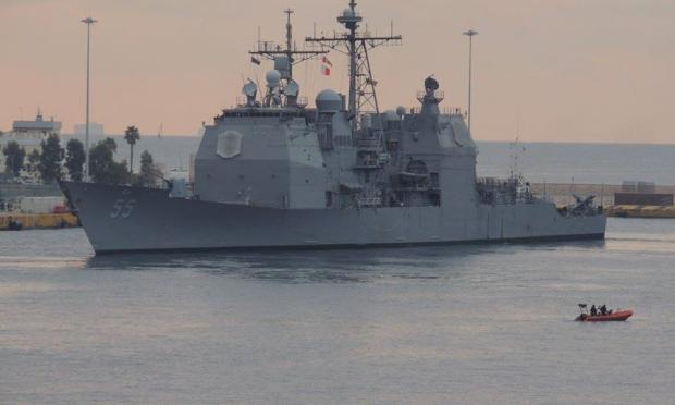 Το πλοίο στάθμευσε για ορισμένες ημέρες στον Πειραιά προκειμένου να ξεκουραστεί το πλήρωμα. Το συγκεκριμένο καταδρομικό είναι στη θάλασσα σε διάφορες αποστολές τους τελευταίους 9 μήνες κάτι που φαίνεται από το γεγονός πως δεν είναι το «καλογυαλισμένο» πλοίο μιας υπερδύναμης.