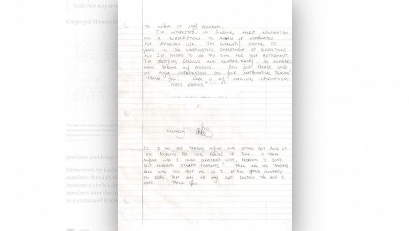 Στο γράμμα ανέφερε ότι οι αριθμοί είχαν γίνει η «αποστολή» της ζωής του κι ότι αποφάσισε να αξιοποιήσει το χρόνο του στο κελί του για να βελτιωθεί, αν και δεν είχε, όπως παραπονέθηκε, κάποιον με τον οποίο να μπορούσε να συζητήσει τα περίπλοκα προβλήματα των Μαθηματικών.