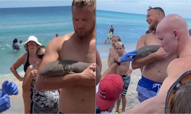 Μία παράξενη εικόνα είδαν οι λουόμενοι που βρίσκονταν στην παραλία, καθώς ένας νεαρός άνδρας βγήκε από το νερό, έχοντας στην… αγκαλιά του ένα μικρό καρχαρία τροφό, λες και ήταν το… μωρό του. Όμως, η αλήθεια ήταν αρκετά… διαφορετική και επίπονη για τον άνδρα.