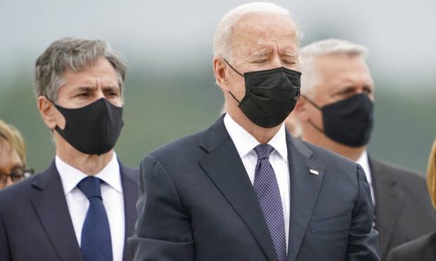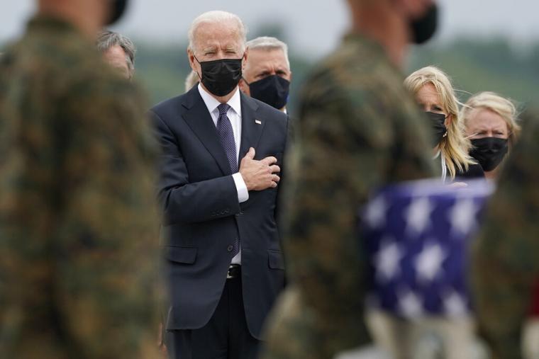 Ο πρόεδρος Τζο Μπάιντεν έκλεισε τα μάτια και έγειρε προς τα πίσω το κεφάλι, καθώς τα φέρετρα, τυλιγμένα με την αμερικανική σημαία, με τις σορούς των 11 Αμερικανών στρατιωτών οι οποίοι σκοτώθηκαν στη βομβιστική επίθεση της περασμένης Πέμπτης στην Καμπούλ, έφτασαν με στρατιωτικό αεροσκάφος στη βάση Ντόβερ του Ντέλαγουερ.