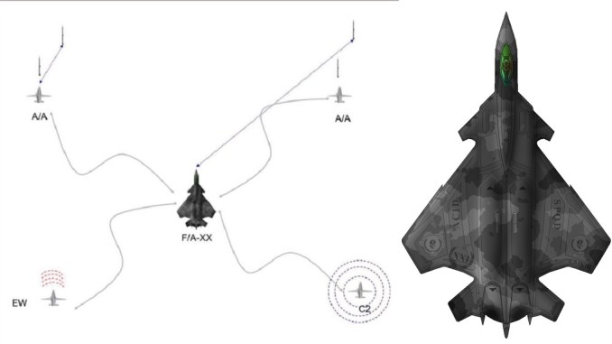 Όταν πρόκειται για το τι ακριβώς θα «κάνει» το F/A-XX, φαίνεται να πετά συνδυαστικά με δύο drones αέρος-αέρος ("A/A"), οπλισμένα με πυραύλους αέρος-αέρος, καθώς και ένα με πακέτο ηλεκτρονικού πολέμου ("EW") και έναν άλλο διαμορφωμένο τύπο διοίκησης και ελέγχου ("C2"). Αν και δεν παρέχονται περαιτέρω πληροφορίες, το μη επανδρωμένο αεροσκάφος C2 θεωρείται πιθανό ότι είναι εξοπλισμένο με μια προηγμένη πύλη επικοινωνίας, ικανή να συνδέει αεροσκάφη stealth, όπως αναμένεται να είναι τα F/A-XX, και μη stealth, καθώς και διάφορα άλλους κόμβους, συμπεριλαμβανομένων εκείνων στο έδαφος και στη θάλασσα.