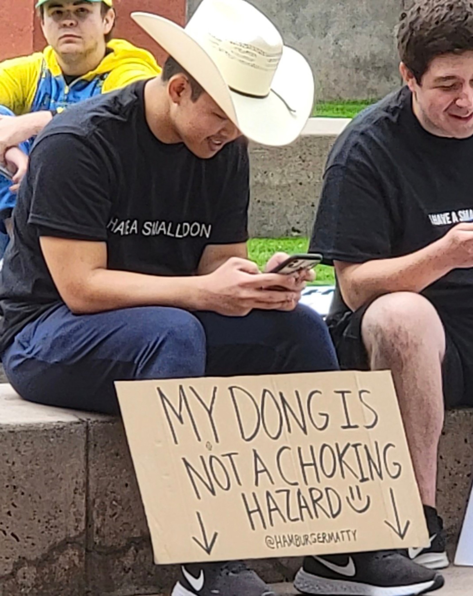 Συγκεκριμένα, δύο άνδρες προσήλθαν στο συλλαλητήριο ντυμένοι χοτ ντογκ. Κρατούσαν πινακίδες που έγραφαν «Όλα τα πέη είναι ίσα», «Σταματήστε να ντροπιάζετε τα μικρά πέη». Ένας άλλος, φορώντας στολή πέους, κουνούσε μια αφίσα που έγραφε «όλα τα πέη πάνε στον παράδεισο».