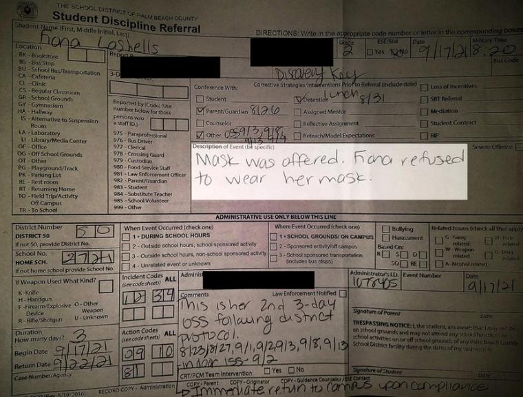 Τον Ιούλιο, ο κυβερνήτης Ρον Ντε ΣάντιςRon DeSantis υπέγραψε εκτελεστικό διάταγμα που καθιστούσε προαιρετική τη χρήση μάσκας προσώπου στα δημόσια σχολεία. Αλλά στην κομητεία Παλμ Μπιτς, ένα από τα πιο ισχυρά προπύργια των Δημοκρατικών στην Πολιτεία Σάνσαϊν, το μέλος του διοικητικού συμβουλίου, η Αλεξάντρια Αγιάλα, υπήρξε ένθερμος υποστηρικτής της υποχρεωτικής μάσκας στα σχολεία.