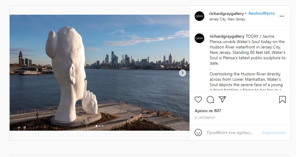 Εδώ και λίγες μέρες, μια νέα site-specific εγκατάσταση με επωνυμία «Water’s Soul», μια ύψους 24 μέτρων κεφαλή από λευκή ρητίνη, ορθώνεται πάνω από το Newport Pier Park στην Jersey City απέναντι από το κάτω Μανχάταν στον ποταμό Χάντσον· το πρόσωπο μιας νεαρής γυναίκας που έχει φέρει το δάχτυλο στα χείλη, ούσα σε σιωπηρό αναστοχασμό.
