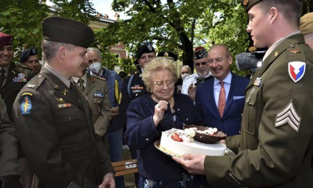 Με τις ευχές του «Happy Birthday» στα ιταλικά και τα αγγλικά, ο στρατός των ΗΠΑ τραγούδησε σε μια Ιταλίδα, με μια τούρτα γενεθλίων την Πέμπτη για να αντικαταστήσει αυτήν που έφαγαν οι Αμερικανοί στρατιώτες καθώς έμπαιναν στην πόλη της κατά τη διάρκεια μιας από τις τελευταίες μάχες του Δευτέρου Παγκοσμίου Πολέμου.