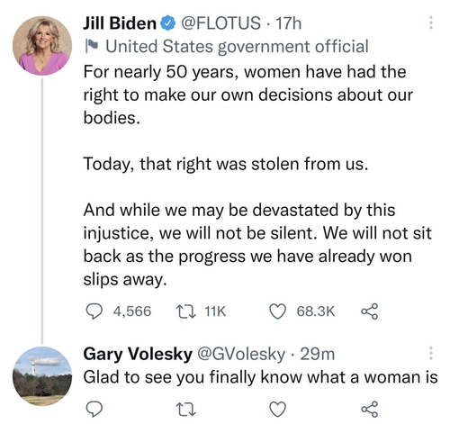 "Εδώ και σχεδόν 50 χρόνια, οι γυναίκες έχουν το δικαίωμα να παίρνουμε τις δικές μας αποφάσεις για το σώμα μας. Σήμερα, αυτό το δικαίωμα μας το έκλεψαν", ανέφερε το αρχικό tweet της Τζιλ Μπάιντεν. Ο στρατηγός Βολέσκι απάντησε χρησιμοποιώντας τον προσωπικό του λογαριασμό στο Twitter: "Χαίρομαι που βλέπω ότι επιτέλους ξέρετε τι είναι γυναίκα".