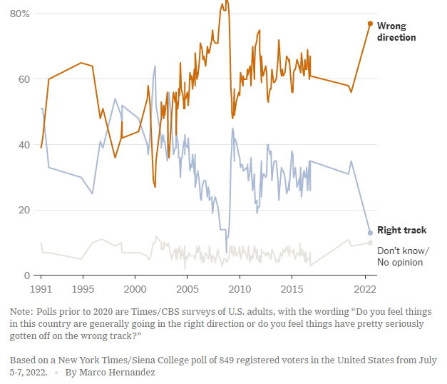 Η ευρέως διαδεδομένη ανησυχία για την οικονομία και τον πληθωρισμό οδήγησε σε σκοτεινή περίοδο, τόσο για τον κ. Μπάιντεν όσο και για την πορεία του έθνους, αναφέρεται. Πάνω από τα τρία τέταρτα των εγγεγραμμένων ψηφοφόρων βλέπουν τις Ηνωμένες Πολιτείες να κινούνται προς τη λάθος κατεύθυνση, υπάρχει μια διάχυτη αίσθηση απαισιοδοξίας που καλύπτει κάθε γωνιά της χώρας, κάθε ηλικιακή και φυλετική ομάδα, πόλεις, προάστια και αγροτικές περιοχές, καθώς και πολιτικά κόμματα.