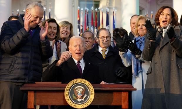 Μαζί του ήταν επίσης η πρώτη κυρία Τζιλ Μπάιντεν και η αντιπρόεδρος Καμάλα Χάρις και ο σύζυγός της, Νταγκ Έμχοφ.
