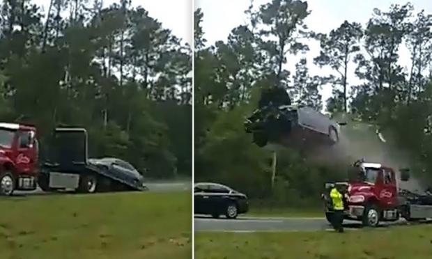 Μία απρόσεκτη οδηγός 21 ετών, τραυματίστηκε σοβαρά όταν το αυτοκίνητό της «πέταξε» πάνω από σταματημένο γερανό στον αυτοκινητόδρομο 84 της πολιτείας Τζόρτζια. Το όχημα είχε σταματήσει προκειμένου να ρυμουλκήσει άλλο όχημα μετά από σύγκρουση.