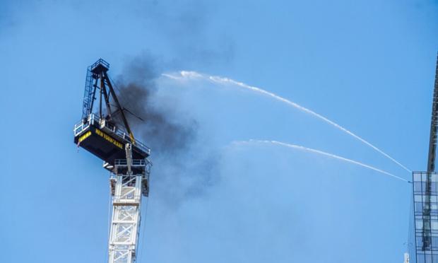 Πλάνα από το σημείο δείχνουν το επάνω τμήμα του γερανού να αποκολλάται και να πέφτει στο έδαφος, χτυπώντας στην πτώση του ένα διπλανό κτίριο. Ταυτόχρονα, φλόγες και καπνός υψώνονται από την καμπίνα του γερανού.