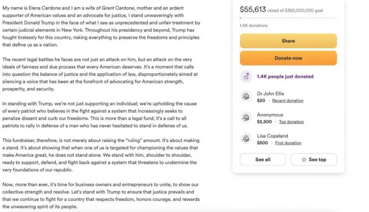 «Οι πρόσφατες νομικές μάχες που αντιμετωπίζει δεν είναι απλώς μια επίθεση εναντίον του, αλλά μια επίθεση στα ίδια τα ιδανικά της δικαιοσύνης και της δίκαιης διαδικασίας που αξίζει κάθε Αμερικανός», αναφέρεται σε μια προσπάθεια του GoFundMe που ξεκίνησε την Παρασκευή και επιδιώκει να συγκεντρώσει το εννιαψήφιο ποσό που οφείλει πλέον ο Τραμπ. «Είναι μια στιγμή που θέτει υπό αμφισβήτηση την ισορροπία της δικαιοσύνης και την εφαρμογή του νόμου, με δυσανάλογο στόχο τη φίμωση μιας φωνής που βρίσκεται στην πρώτη γραμμή της υπεράσπισης της αμερικανικής δύναμης, ευημερίας και ασφάλειας».