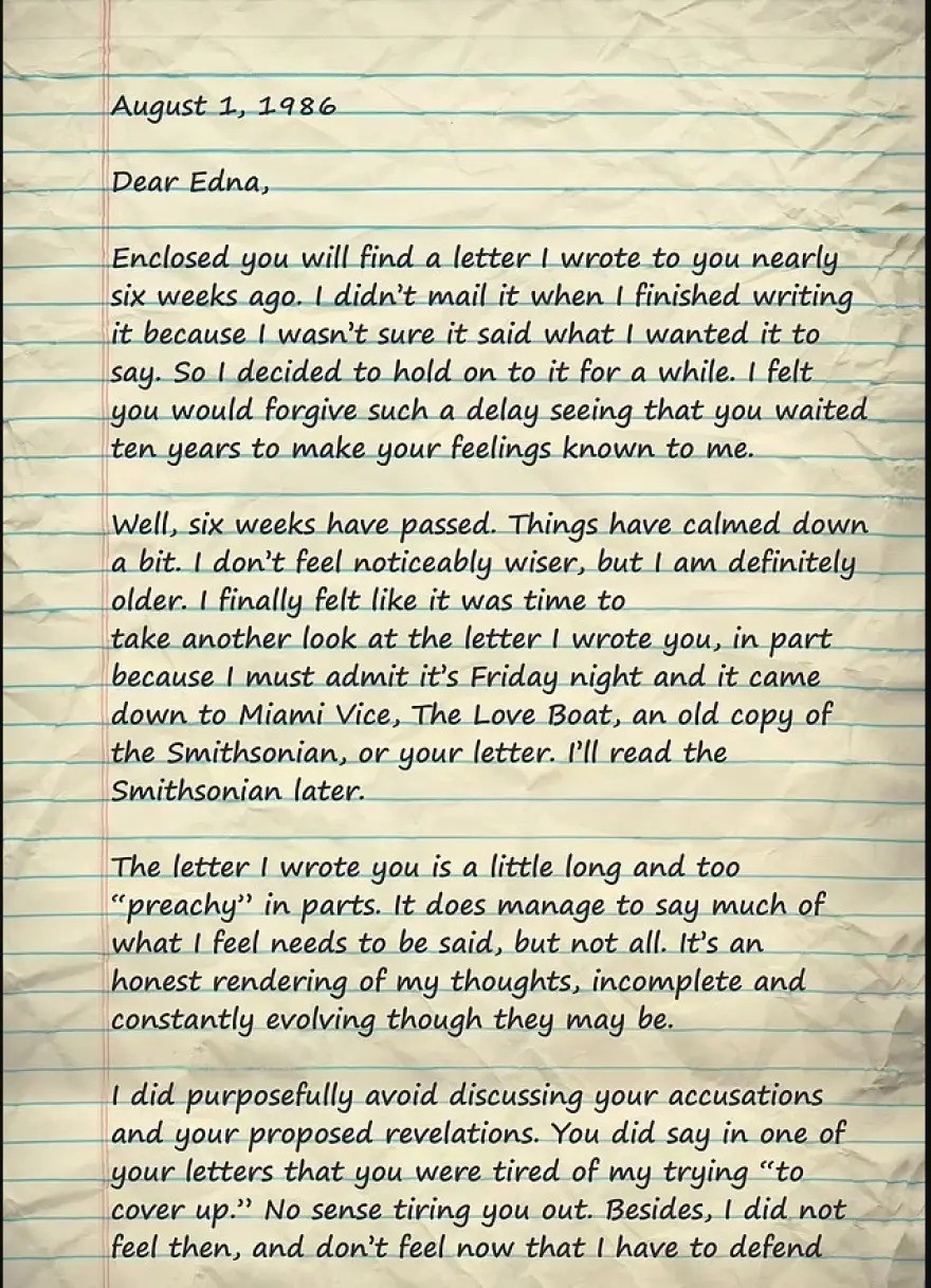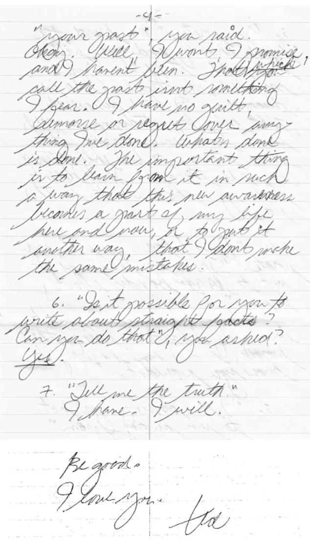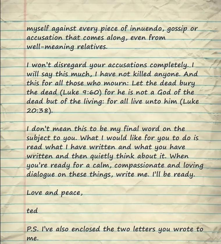 Σε μια άλλη επιστολή που έστειλε στην ξαδέλφη του τον Νοέμβριο της ίδιας χρονιάς, ο Bundy έγραφε ότι «δεν νιώθει τύψεις ούτε μετανιώνει για τίποτα απ’ όσα έχει κάνει στη ζωή του» και της επισήμαινε ότι βασίζει τα συμπεράσματά της σε τυχαίες αναμνήσεις που έχει απο εκείνον αλλά κυρίως στα «κίτρινα» δημοσιεύματα των εφημερίδων, τις φήμες και τα κουτσομπολιά που έχουν ακουστεί για εκείνον μέσα στα χρόνια.