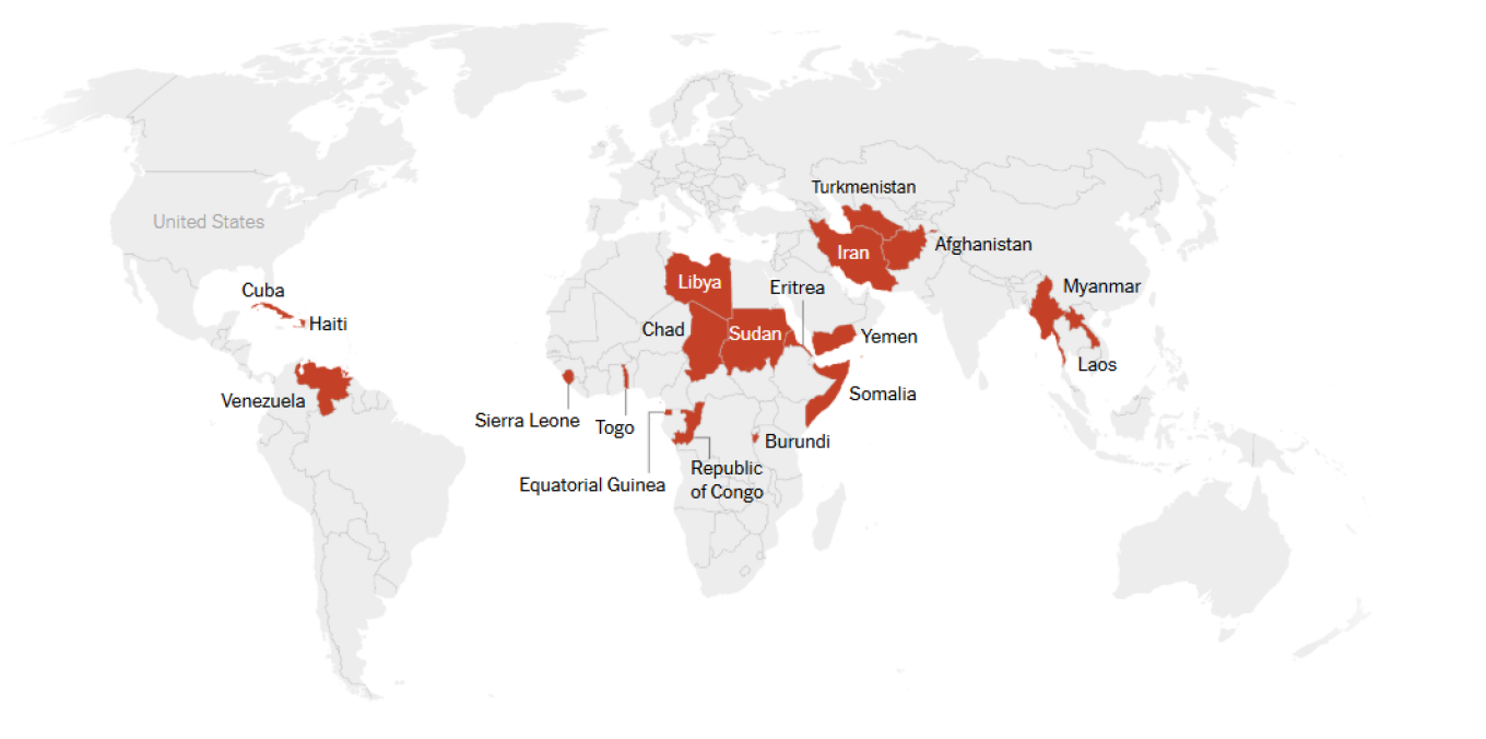 Η νέα οδηγία επηρεάζει πολίτες από κράτη που θεωρούνται από τα φτωχότερα και πιο πολιτικά ασταθή παγκοσμίως. Η λίστα περιλαμβάνει χώρες υπό καθεστώς πλήρους απαγόρευσης (Αφγανιστάν, Μιανμάρ, Τσαντ, Λαϊκή Δημοκρατία του Κονγκό, Ισημερινή Γουινέα, Ερυθραία, Αϊτή, Ιράν, Λιβύη, Σομαλία, Σουδάν, Υεμένη), καθώς και χώρες με μερικούς περιορισμούς (Μπουρούντι, Κούβα, Λάος, Σιέρρα Λεόνε, Τόγκο, Τουρκμενιστάν, Βενεζουέλα). Πλέον, μπλοκάρεται κάθε διαδικασία απόκτησης καθεστώτος μέσω της αρμόδιας υπηρεσίας για τους υπηκόους αυτών των χωρών.