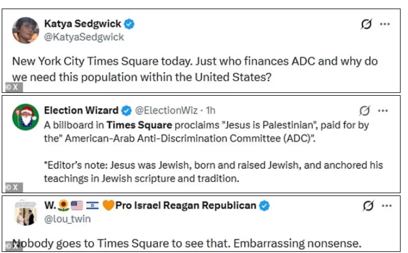 Από την πλευρά της, η ADC υπερασπίστηκε την καμπάνια, υπογραμμίζοντας ότι ο σκοπός δεν ήταν να αμφισβητήσει την εβραϊκή καταγωγή του Ιησού αλλά να ανοίξει χώρο για διάλογο και αναγνώριση κοινών πολιτισμικών και θρησκευτικών στοιχείων μεταξύ χριστιανών, μουσουλμάνων και αράβων Αμερικανών. Ο εκτελεστικός διευθυντής της οργάνωσης, Abed Ayoub, δήλωσε ότι η πινακίδα επιδιώκει να προωθήσει μια συζήτηση γύρω από κοινές ρίζες και αξίες και όχι μόνο γύρω από μια γεωγραφική ή εθνοτική ταυτότητα. Ο ίδιος επέμεινε πως το μήνυμα δεν ήταν σχεδιασμένο για να προκαλέσει διχασμό, αλλά να ενθαρρύνει την ανταλλαγή απόψεων σε μια εποχή όπου πολλές φωνές μπορεί να μην ακούγονται.