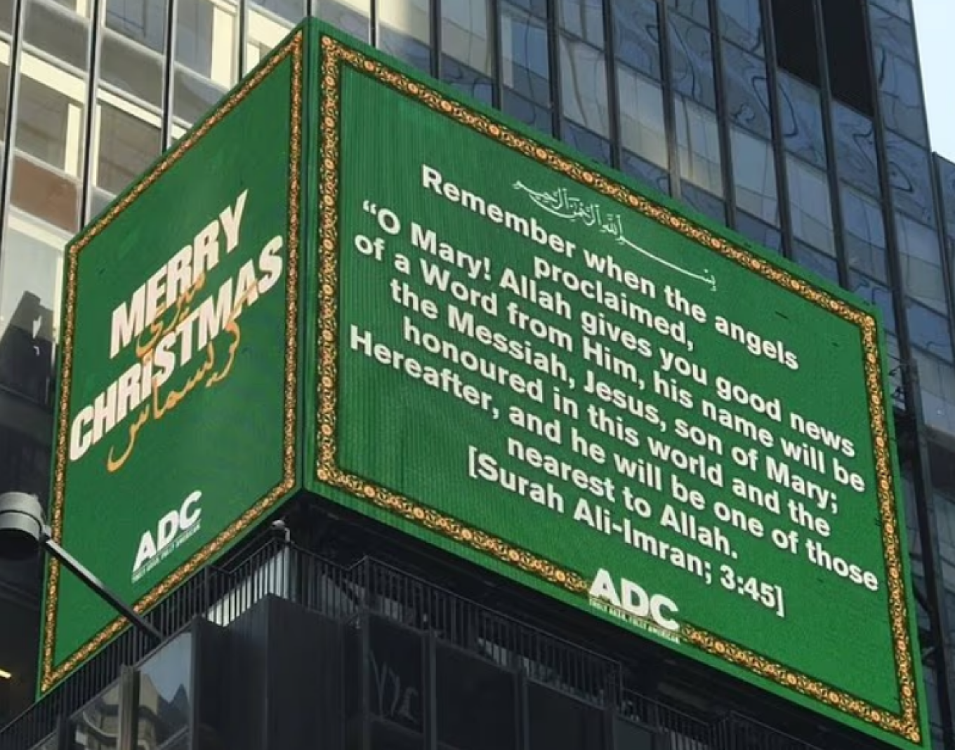 Η ψηφιακή επιγραφή, με μεγάλα μαύρα γράμματα σε πράσινο φόντο, συνδύαζε το πρωτότυπο μήνυμα με μια ευχή «Merry Christmas», καθιστώντας την άμεση και ορατή σε χιλιάδες ανθρώπους που βρίσκονταν εκεί την περίοδο των εορτών. Η καμπάνια χρηματοδοτήθηκε και υποστηρίχθηκε από την American Arab Anti-Discrimination Committee (ADC), μια οργάνωση που επιδιώκει να ενισχύσει την κοινότητα Αράβων Αμερικανών και να φέρει στο προσκήνιο ζητήματα πολιτιστικών και θρησκευτικών ταυτοτήτων.