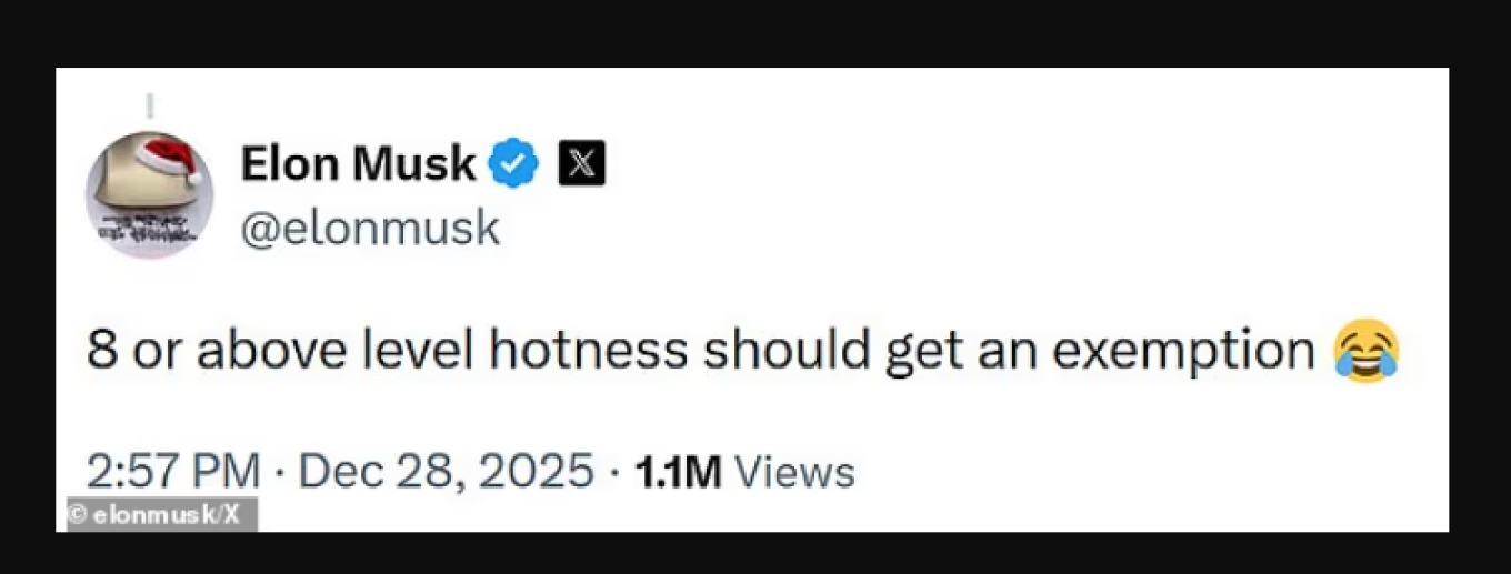 Συγκεκριμένα, ο Έλον Μασκ έγραψε ότι «οι sexy γυναίκες θα έπρεπε να εξαιρούνται», μια φράση που μέσα σε λίγα λεπτά άρχισε να αναπαράγεται μαζικά. Το σχόλιο έγινε viral, συγκεντρώνοντας χιλιάδες αντιδράσεις, κοινοποιήσεις και απαντήσεις, ενώ αποτέλεσε αντικείμενο έντονης κριτικής από χρήστες που έκαναν λόγο για σεξιστική προσέγγιση και υποβάθμιση ενός σοβαρού νομικού και ανθρώπινου ζητήματος.