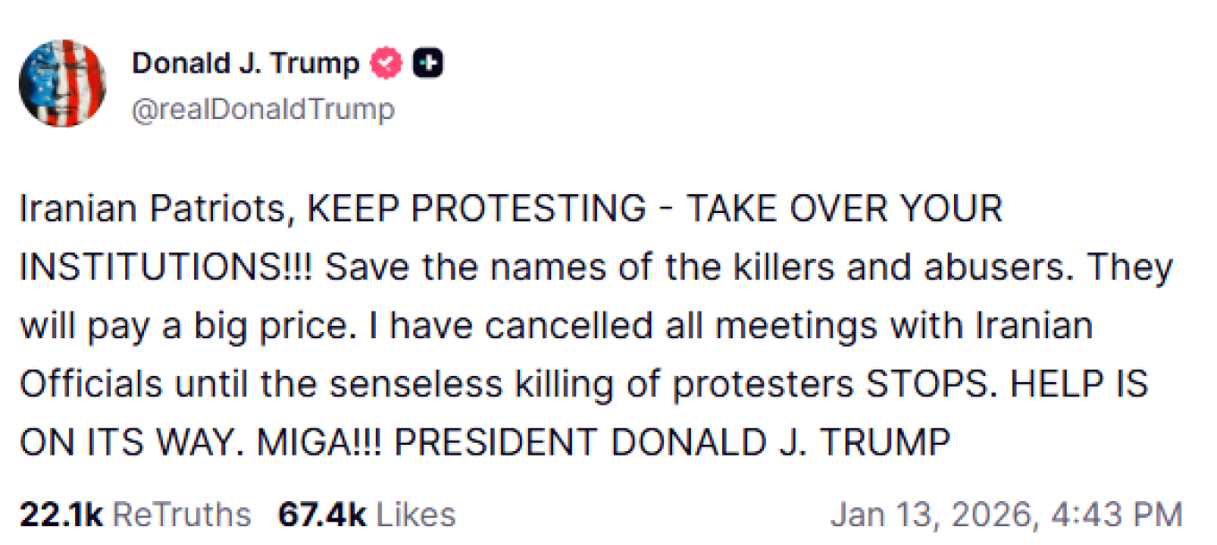 Παράλληλα, με ανάρτησή του στην πλατφόρμα Truth Social, κάλεσε ανοιχτά τους Ιρανούς πολίτες να «συνεχίσουν να διαδηλώνουν», υποστηρίζοντας ότι «η βοήθεια είναι καθ’ οδόν». Η παρέμβαση αυτή προκάλεσε άμεση και έντονη αντίδραση της Τεχεράνης, η οποία την εξέλαβε ως ευθεία ανάμειξη στα εσωτερικά της χώρας.