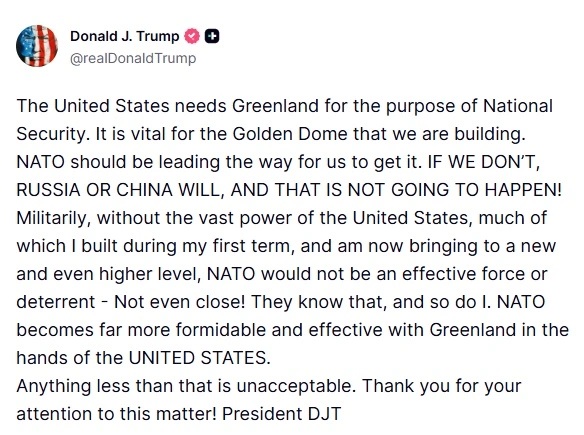 Σε ανάρτησή του στο Truth Social, ο Τραμπ προειδοποίησε το ΝΑΤΟ «ότι πρέπει να καθοδηγήσει τις ΗΠΑ στο να αποκτήσουν την Γροιλανδία» ενώ ισχυρίστηκε ότι «αν δεν το κάνουμε εμείς, θα το κάνουν η Ρωσία ή η Κίνα, και αυτό δεν πρόκειται να συμβεί!».