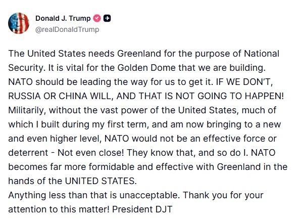 «Από στρατιωτικής άποψης, χωρίς την τεράστια δύναμη των ΗΠΑ, την οποία έχτισα σε μεγάλο βαθμό κατά τη διάρκεια της πρώτης θητείας μου και τώρα την ανεβάζω σε ένα νέο, ακόμη υψηλότερο επίπεδο, το ΝΑΤΟ δεν θα ήταν αποτελεσματική δύναμη ή αποτρεπτικός παράγοντας. Ούτε καν κοντά σε αυτό! Το ξέρουν αυτό, και το ξέρω και εγώ. Το ΝΑΤΟ γίνεται πολύ πιο ισχυρό και αποτελεσματικό με τη Γροιλανδία στα χέρια των ΗΠΑ. Οτιδήποτε λιγότερο από αυτό είναι απαράδεκτο».