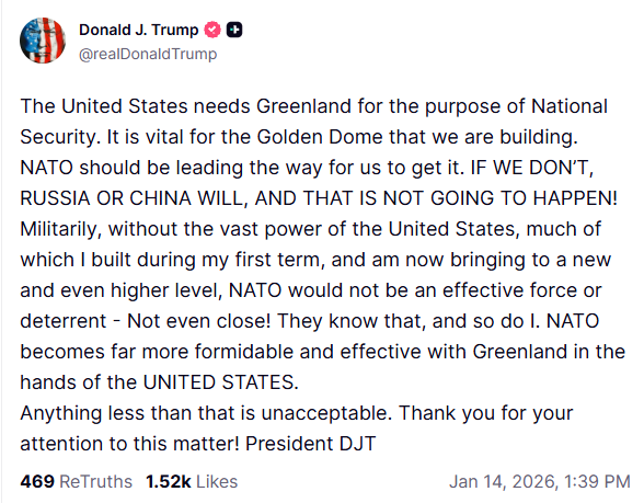 Ο Τραμπ ξεκαθάρισε ότι «τίποτα λιγότερο από την απόκτηση της Γροιλανδίας» δεν είναι αποδεκτό. Χρησιμοποιεί το ΝΑΤΟ όχι ως συμμαχία ίσων, αλλά ως εισπρακτική εταιρεία που πρέπει να του «παραδώσει» το νησί. Το υπονοούμενο είναι τρομακτικό: Αν το ΝΑΤΟ δεν υπακούσει, ο «Βασιλιάς» θα το διαλύσει. Η αναφορά του στο "Golden Dome" (τον Χρυσό Θόλο της αντιπυραυλικής άμυνας) είναι το πρόσχημα. Στην πραγματικότητα, θέλει να ελέγξει τον Αρκτικό θησαυρό, πατώντας πάνω στην εθνική κυριαρχία της Δανίας σαν να μην υπήρξε ποτέ.