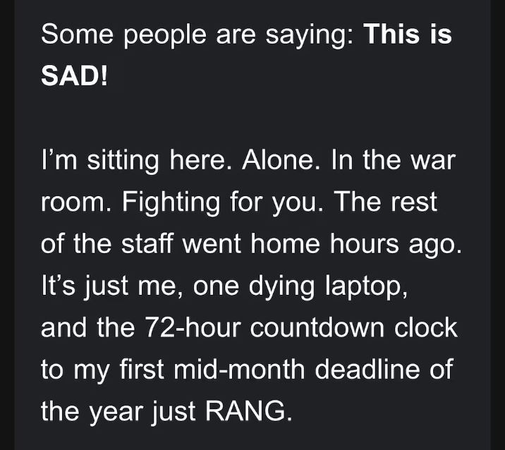 Ο πολιτικός σχολιαστής Χάρι Σίσον δημοσίευσε στιγμιότυπα οθόνης του email στο X στις 13 Ιανουαρίου, τα οποία γρήγορα συγκέντρωσαν 1,4 εκατομμύρια προβολές. Το ίδιο το email ξεκινούσε με τη φράση: «Μερικοί λένε: Αυτό είναι λυπηρό! Κάθομαι εδώ. Μόνος. Στο δωμάτιο πολέμου. Παλεύω για εσάς», έγραψε. «Το υπόλοιπο προσωπικό πήγε σπίτι του πριν από ώρες. Είμαι μόνο εγώ, ένα ετοιμοθάνατο λάπτοπ και το ρολόι αντίστροφης μέτρησης 72 ωρών για την πρώτη μου προθεσμία στα μέσα του μήνα μόλις χτύπησε.»