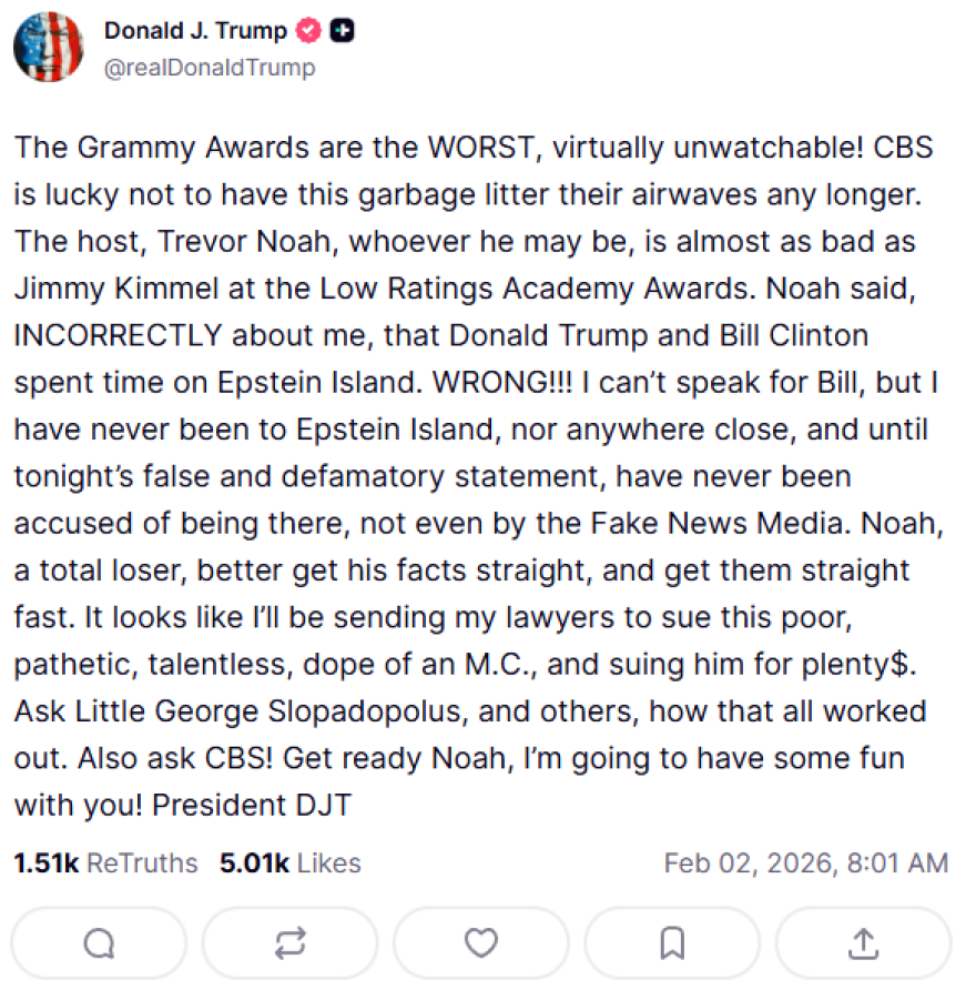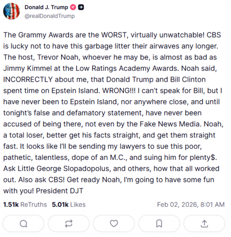 «Τα Βραβεία Grammy είναι τα ΧΕΙΡΟΤΕΡΑ, σχεδόν αδύνατο να τα παρακολουθήσει κανείς! Το CBS είναι τυχερό που αυτά τα σκουπίδια δεν περιλαμβάνονται πλέον στο τηλεοπτικό του πρόγραμμα. Ο παρουσιαστής, ο Τρέβορ Νόα — όποιος κι αν είναι — είναι σχεδόν τόσο κακός όσο ο Τζίμι Κίμελ στα Όσκαρ με τα χαμηλά ποσοστά τηλεθέασης. Ο Νόα είπε, ΛΑΝΘΑΣΜΕΝΑ, ότι εγώ και ο Μπιλ Κλίντον περάσαμε χρόνο στο νησί του Έπσταϊν. ΛΑΘΟΣ!!! Δεν μπορώ να μιλήσω για τον Μπιλ, αλλά εγώ δεν έχω πάει ποτέ στο νησί του Έπσταϊν, ούτε πουθενά κοντά, και μέχρι απόψε, με αυτή την ψευδή και συκοφαντική δήλωση, δεν είχε ποτέ ειπωθεί κάτι τέτοιο, ούτε καν από τα Fake News Media. Ο Νόα, ένας απόλυτος loser, καλό θα ήταν να βάλει τα γεγονότα στη σωστή τους θέση και μάλιστα γρήγορα. Φαίνεται πως θα στείλω τους δικηγόρους μου για να μηνύσουν αυτόν τον αξιοθρήνητο, άταλαντο και ανίκανο παρουσιαστή, διεκδικώντας μεγάλα ποσά. Ρωτήστε τον “Μικρό” Τζορτζ Στεφανόπουλο και άλλους πώς κατέληξε όλο αυτό. Ρωτήστε και το CBS! Ετοιμάσου, Νόα. Θα περάσω καλά μαζί σου!»