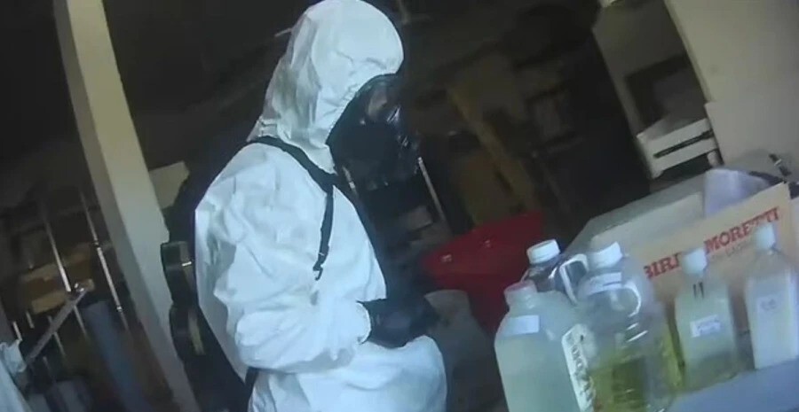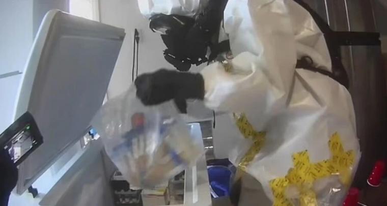 Νεότερο οπτικό υλικό που έδωσε στη δημοσιότητα η Μητροπολιτική Αστυνομία του Λας Βέγκας δείχνει μια εκτεταμένη επιχείρηση με στολές προστασίας, καθώς πράκτορες απομάκρυναν σακούλες με ιατρικούς σωλήνες, φιαλίδια και δοχεία γεμάτα άγνωστα υγρά από το προάστιο όπου βρίσκεται το ακίνητο.