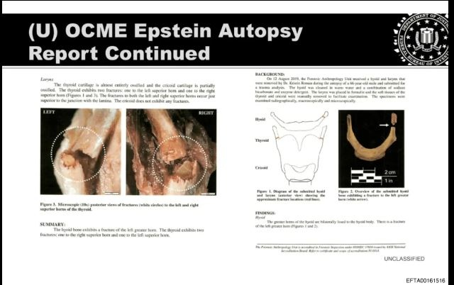 Ωστόσο, οι φωτογραφίες εξετάστηκαν εξονυχιστικά από ανεξάρτητους παρατηρητές και ειδικούς που προσλήφθηκαν από την οικογένεια Επστάιν. Ο ιατροδικαστής Μάικλ Μπέιντεν, ο οποίος παρακολούθησε τη νεκροτομή, είχε επισημάνει ότι τα κατάγματα που εντοπίστηκαν στον λαιμό του Επστάιν (και συγκεκριμένα στο υοειδές οστό) είναι πιο συνηθισμένα σε περιπτώσεις στραγγαλισμού (ανθρωποκτονίας) παρά σε απαγχονισμούς, ειδικά όταν αυτοί γίνονται από χαμηλό ύψος (γονυπετής), όπως συνέβη στην περίπτωση του Επστάιν.