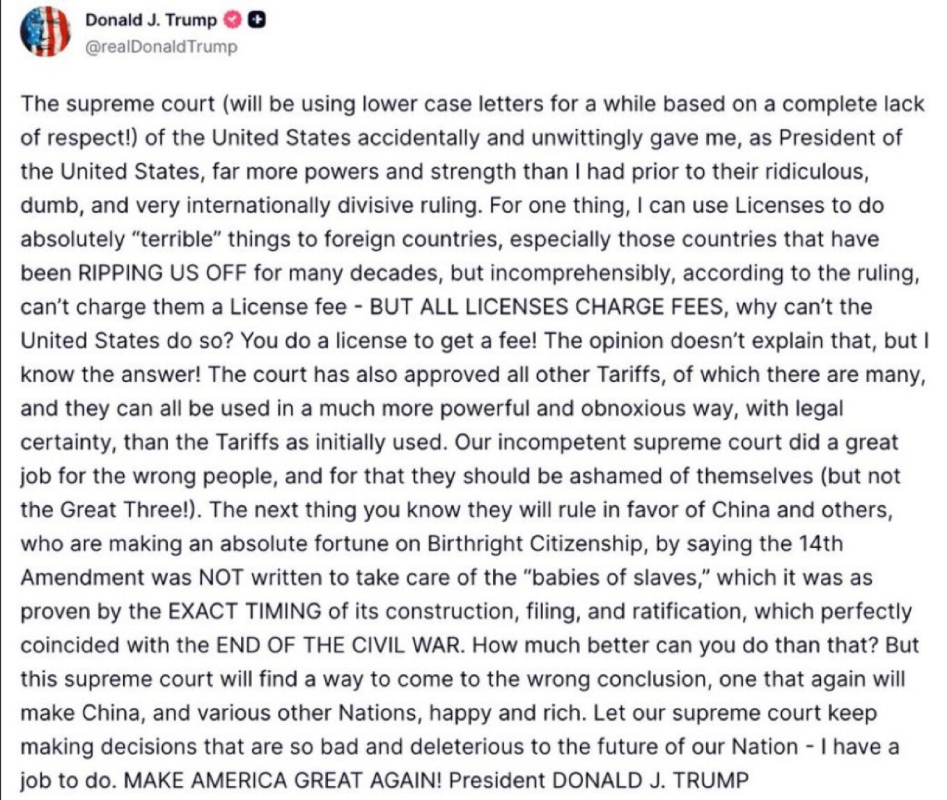 «Το ανώτατο δικαστήριο (θα χρησιμοποιήσω πεζά τώρα, ελλείψει κάθε σεβασμού!) των Ηνωμένων Πολιτειών μου έδωσε κατά τύχη και ασυνειδήτως, εμένα, του Προέδρου των Ηνωμένων Πολιτειών, πολύ περισσότερες εξουσίες και δύναμη απ' αυτές που είχα πριν τη γελοία, ηλίθια και πολύ πολωτική σε διεθνές επίπεδο απόφασή τους», έγραψε καταγγέλλοντας την απόφαση του δικαστηρίου να περικόψει μεγάλο μέρος των δικαιωμάτων του επί της δασμολογικής πολιτικής.