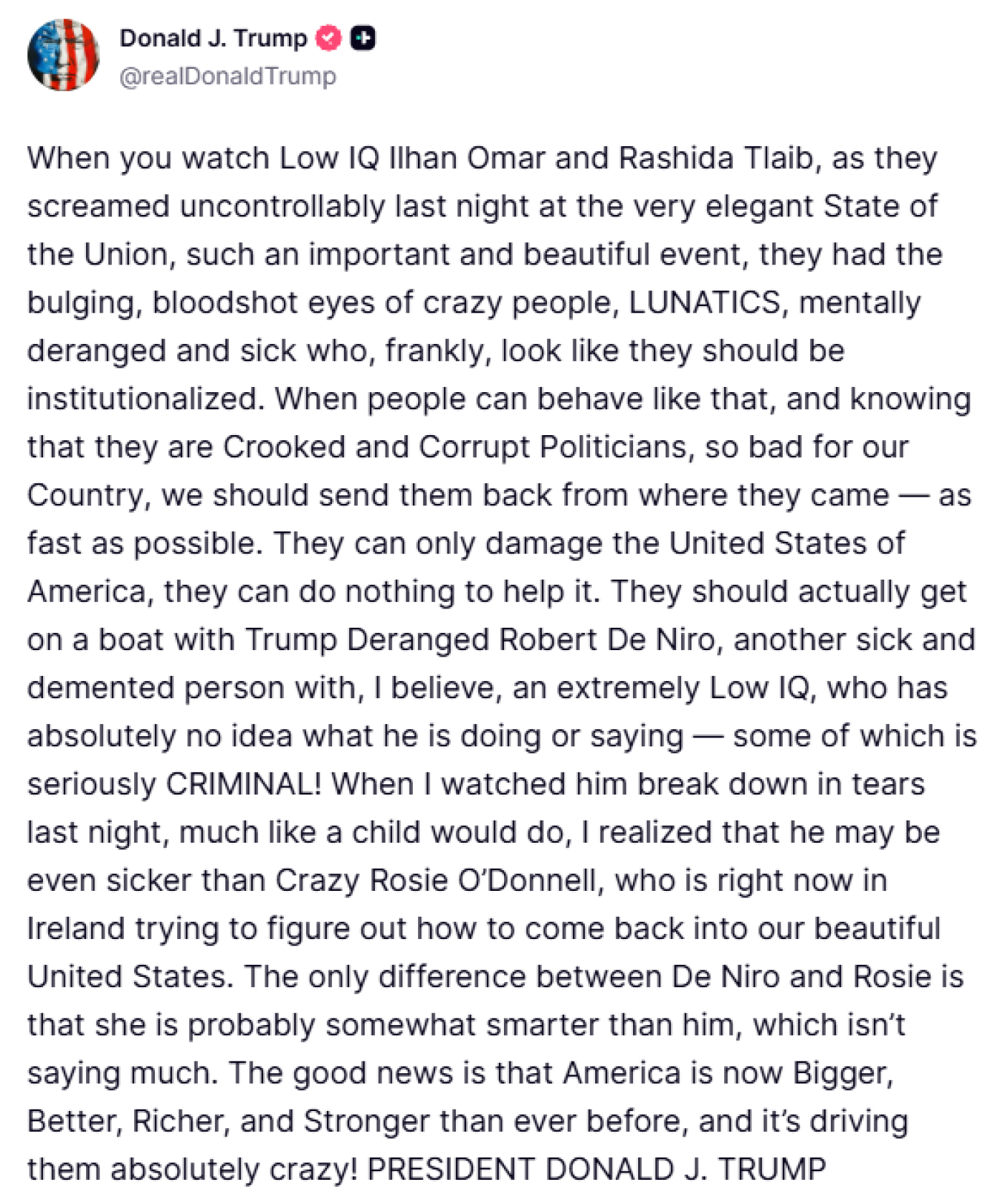 Στο ίδιο παραλήρημα, ο πρόεδρος ενέπλεξε και τον βραβευμένο με Όσκαρ ηθοποιό, Ρόμπερτ Ντε Νίρο. Αφορμή στάθηκε η σκληρή κριτική που του άσκησε ο ηθοποιός κατά τη διάρκεια της εκδήλωσης «State of the Swamp» που διοργάνωσαν οι Δημοκρατικοί στην Ουάσινγκτον. Ο Τραμπ πρότεινε στις Ομάρ και Τλαΐμπ να επιβιβαστούν «σε ένα σκάφος μαζί με τον παράφρονα Ρόμπερτ Ντε Νίρο», τον οποίο χαρακτήρισε ομοίως «άρρωστο», με εξαιρετικά χαμηλό IQ, προσθέτοντας πως δεν έχει ιδέα τι λέει ή τι κάνει.