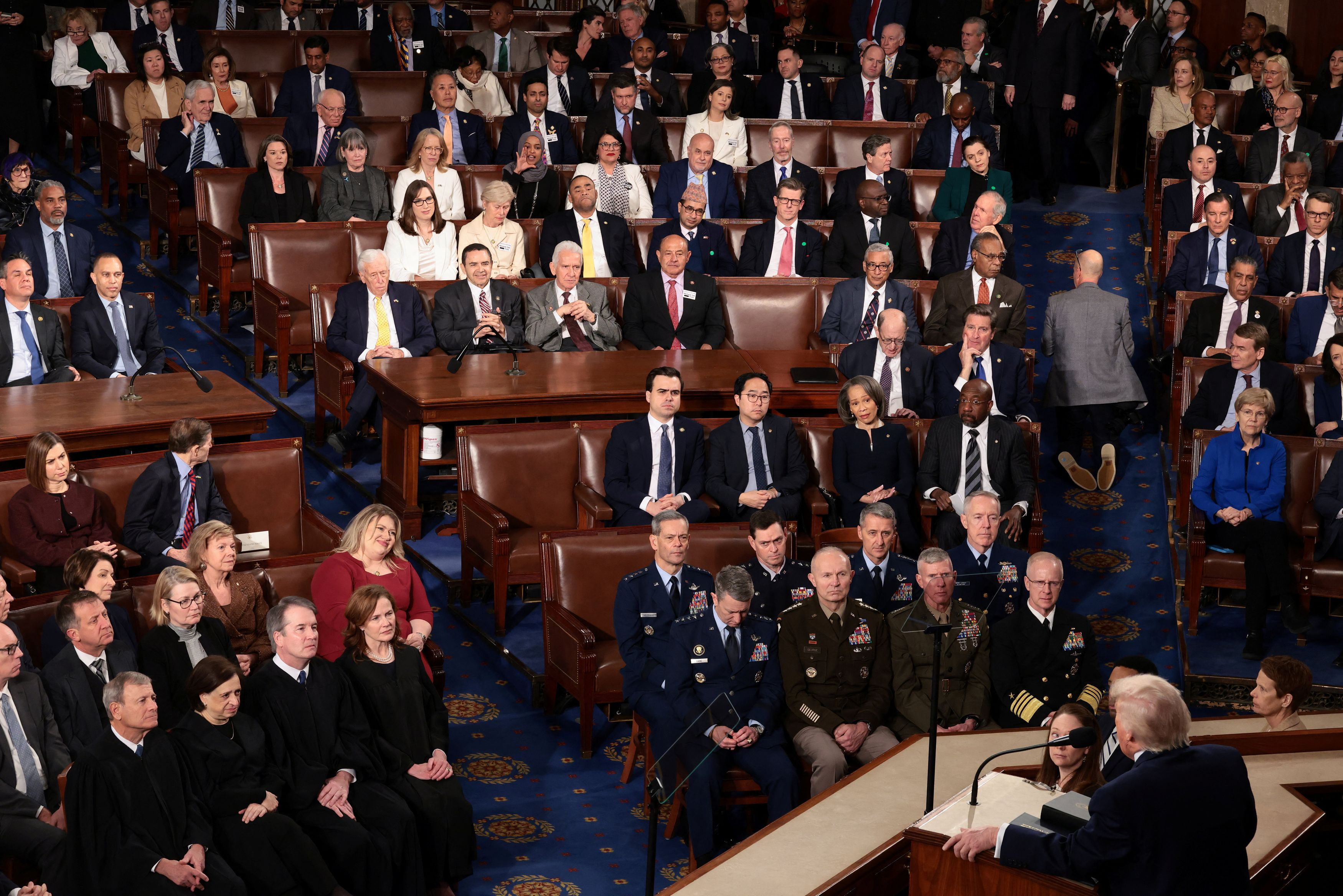 Η ένταση κορυφώθηκε όταν οι δύο γυναίκες διέκοψαν ξανά την ομιλία φωνάζοντας: «Έχεις σκοτώσει Αμερικανούς!». Η κατηγορία αυτή αφορούσε τον θάνατο της Ρενέ Γκουντ και του Άλεξ Πρέτι, οι οποίοι έχασαν τη ζωή τους από ομοσπονδιακούς πράκτορες μετανάστευσης στη Μινεσότα τον προηγούμενο μήνα. Σε μεταγενέστερη δήλωσή της, η Ομάρ ξεκαθάρισε: «Έπρεπε να υπενθυμίσω στον Τραμπ ότι η κυβέρνησή του ήταν υπεύθυνη για τον θάνατο 2 εκ των ψηφοφόρων μου».