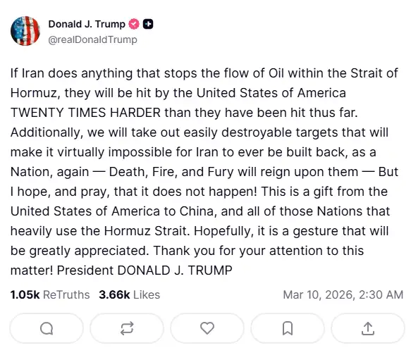 Ο Ντόναλντ Τραμπ απηύθυνε τα ξημερώματα της Τρίτης (10 Μαρτίου 2026) μια εξαιρετικά αυστηρή προειδοποίηση προς το Ιράν. Ο Αμερικανός πρόεδρος κατέστησε σαφές ότι οποιαδήποτε προσπάθεια της Τεχεράνης να διακόψει τη ροή πετρελαίου μέσω των Στενών του Ορμούζ θα αντιμετωπιστεί με στρατιωτικά πλήγματα είκοσι φορές ισχυρότερα από τα μέχρι τώρα δεδομένα.