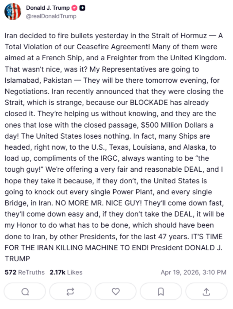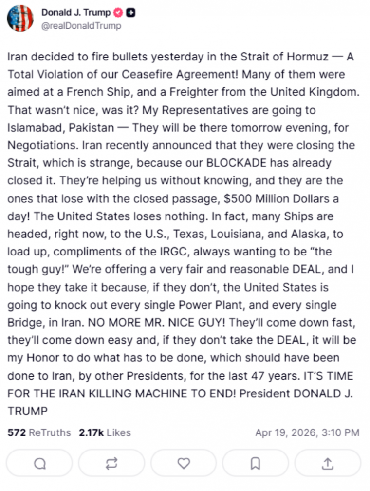 Το Ιράν αποφάσισε χθες να ρίξει πυροβολισμούς στο Στενό του Ορμούζ — Μια πλήρης παραβίαση της συμφωνίας κατάπαυσης του πυρός που έχουμε συνάψει! Πολλοί από αυτούς στόχευαν ένα γαλλικό πλοίο και ένα φορτηγό πλοίο από το Ηνωμένο Βασίλειο. Δεν ήταν και πολύ ωραίο αυτό, έτσι; Οι εκπρόσωποί μου πηγαίνουν στο Ισλαμαμπάντ του Πακιστάν — θα βρίσκονται εκεί αύριο το βράδυ, για διαπραγματεύσεις. Το Ιράν ανακοίνωσε πρόσφατα ότι θα κλείσει το Στενό, κάτι που είναι παράξενο, επειδή ο ΑΠΟΚΛΕΙΣΜΟΣ μας το έχει ήδη κλείσει. Μας βοηθούν χωρίς να το γνωρίζουν, και είναι αυτοί που χάνουν από το κλειστό πέρασμα, 500 εκατομμύρια δολάρια την ημέρα! Οι Ηνωμένες Πολιτείες δεν χάνουν τίποτα. Στην πραγματικότητα, πολλά πλοία κατευθύνονται, αυτή τη στιγμή, προς τις ΗΠΑ, το Τέξας, τη Λουιζιάνα και την Αλάσκα, για να φορτωθούν, χάρη στο IRGC, που θέλει πάντα να είναι «ο σκληρός τύπος»! Προσφέρουμε μια πολύ δίκαιη και λογική ΣΥΜΦΩΝΙΑ, και ελπίζω να την αποδεχθούν, γιατί, αν δεν το κάνουν, οι Ηνωμένες Πολιτείες θα καταστρέψουν κάθε μονάδα παραγωγής ηλεκτρικής ενέργειας και κάθε γέφυρα στο Ιράν. ΤΕΛΟΣ Ο Κ. ΚΑΛΟΣ! Θα πέσουν γρήγορα, θα πέσουν εύκολα και, αν δεν δεχτούν τη ΣΥΜΦΩΝΙΑ, θα είναι τιμή μου να κάνω ό,τι πρέπει να γίνει, κάτι που θα έπρεπε να είχαν κάνει άλλοι Πρόεδροι στο Ιράν τα τελευταία 47 χρόνια. ΕΙΝΑΙ ΩΡΑ ΝΑ ΤΕΡΜΑΤΙΣΤΕΙ Η ΜΗΧΑΝΗ ΘΑΝΑΤΟΥ ΤΟΥ ΙΡΑΝ! Πρόεδρος ΝΤΟΝΑΛΝΤ ΤΡΑΜΠ