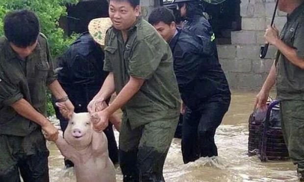 Το γουρουνάκι μεγάλωνε σε φάρμα στο χωριό Ντανλιάο, κοντά στην πόλη Τσιντζόου η οποία πλήγηκε εξαιτίας των καταρρακτωδών βροχών. Στη φωτογραφία που έκανε τον γύρο του διαδικτύου, βλέπουμε δύο διασώστες με πράσινες στολές να βγάζουν το γουρουνάκι από το νερό ενώ αυτό φαίνεται να χαμογελάει.