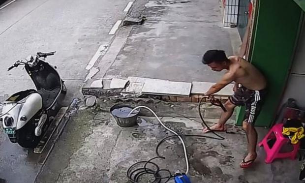 Στο βίντεο φαίνεται να προσπαθεί να χρησιμοποιήσει ένα πιεστικό μηχάνημα για πλύσεις προκειμένου να καθαρίσει ένα δίκυκλο.