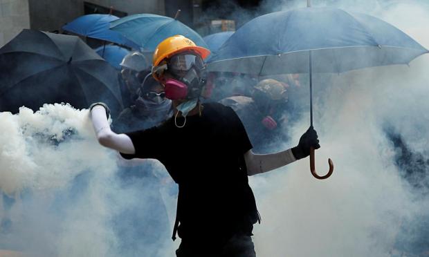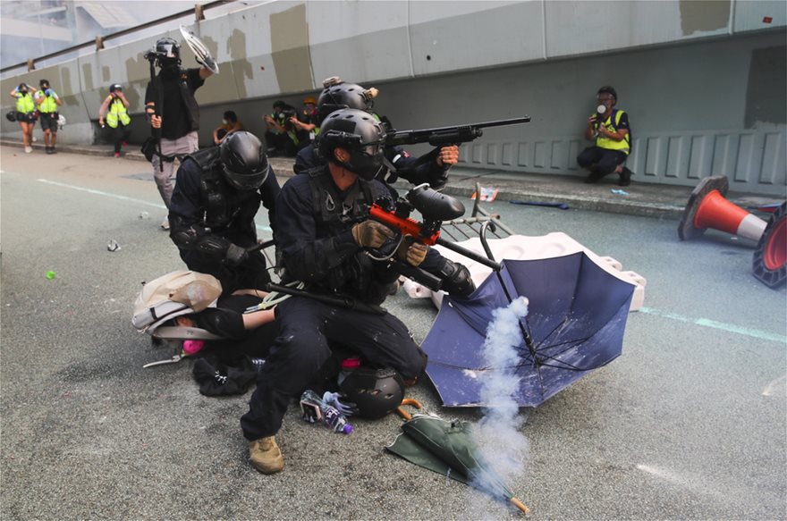 Η αστυνομία χθες βράδυ εκτόξευσε δακρυγόνα και έκανε χρήση αντλιών νερού για να διαλύσει τους διαδηλωτές που πέταξαν βόμβες μολότοφ και πέτρες, έσπασαν παράθυρα σε κυβερνητικά κτίρια και απέκλεισαν βασική οδική αρτηρία κοντά στο τοπικό αρχηγείο του Λαϊκού Απελευθερωτικού Στρατού της Κίνας. Οι αντικυβερνητικοί διαδηλωτές επιτέθηκαν στο Κοινοβούλιο, στο κυριότερο Γραφείο Σύνδεσης με το Πεκίνο, κατέλαβαν το αεροδρόμιο, πέταξαν βόμβες μολότοφ εναντίον αστυνομικών, βανδάλισαν σταθμούς του μετρό και άναψαν φωτιές στους δρόμους. Η αστυνομία απάντησε κάνοντας χρήση δακρυγόνων, αντλιών νερού, σφαιρών από καουτσούκ και περιστασιακά αληθινών προειδοποιητικών πυρών στον αέρα.