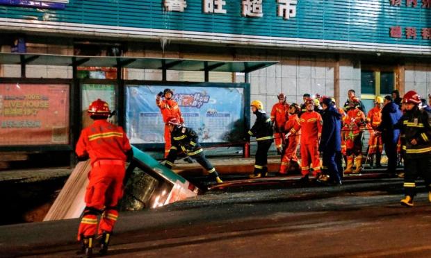 Φωτογραφίες που μεταδόθηκαν από το επίσημο πρακτορείο ειδήσεων Νέα Κίνα εικονίζουν μέλη σωστικών συνεργείων με βαριά μηχανήματα και έναν γερανό να ανυψώνει το λεωφορείο από την τρύπα, που άνοιξε μπροστά σε νοσοκομείο.