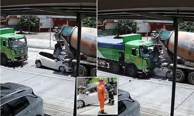 Από τη σφοδρή σύγκρουση το λευκό αυτοκίνητο πετάχτηκε σαν παιχνιδάκι και σφηνώθηκε στο πίσω μέρος της μπετονιέρας, ενώ το φορτηγό που τον χτύπησε χωρίς να σταματήσει καθόλου έπεσε και αυτό πίσω του και το έκανε «φυσαρμόνικα»